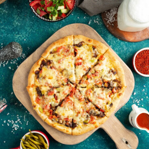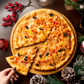 Happy Sunday Premium Pizza is a delightful blend of grilled chicken Italian sausage, bell peppers, onions, and gooey mozzarella.